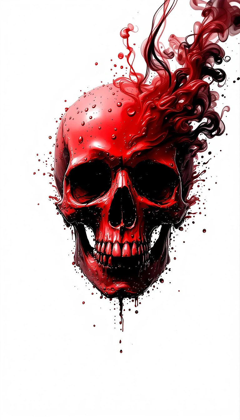 A red skull composed entirely of glistening teardrops, ultra-minimalist and ultrarealistic, inkblot-style composition, soft glowing edges, hyper-detailed reflections in the droplets, stark white background, dramatic shadowplay. Surrounding the skull, tendrils of black ink smoke swirl and rise, subtly morphing into the word ‘pieces’ in Gothic calligraphy. The typography emerges ethereally, as if summoned from liquid shadow, blending seamlessly with the mist, dark elegance, 16K resolution, cinematic lighting