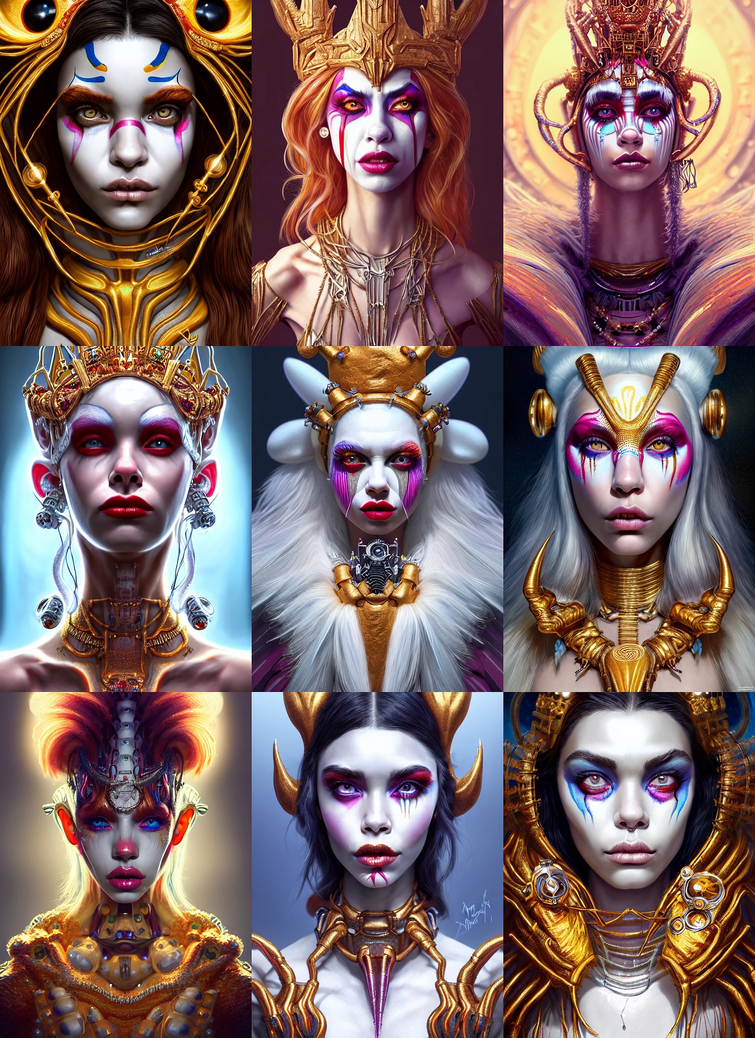 bright white clowncore : : disney weta portrait, soft polished aztec queen devil madison beer cyborg, bling, hi - fructose, sci - fi fantasy intricate decadent highly - detailed digital painting, golden ratio, octane render, artstation, concept art, smooth, sharp focus, illustration, artgerm, mucha, loish, wlop