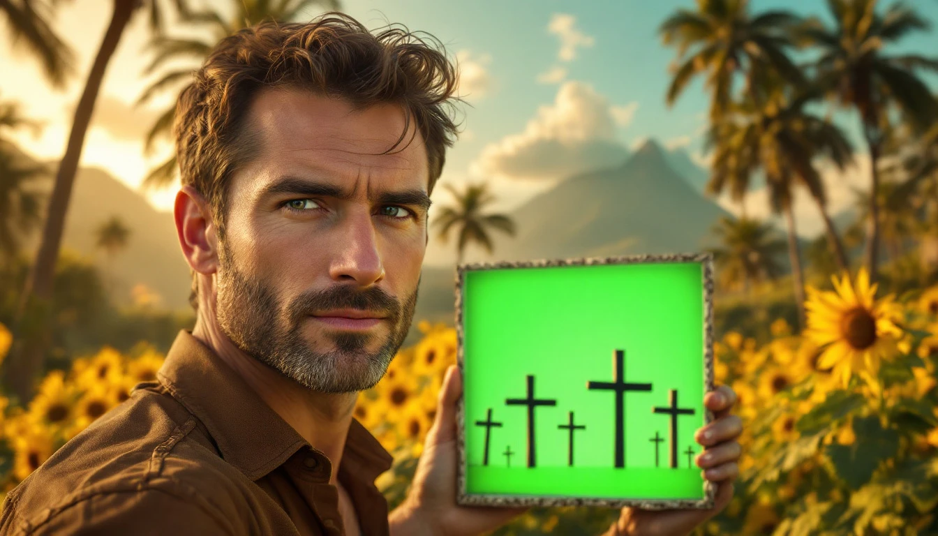 Photorealistic close-up image of a European man from the waist up with a confident and expressive face. It is on the side of a fantasy world filled with tropical trees, a field of sunflowers, mountains and the sea at sunset. In front of him, closer to the camera, there is a cut of a bright green chroma key background with crosses, like a portal between worlds. The stage is lit with a warm golden light, conveying the atmosphere of the film in the style of Wes Anderson