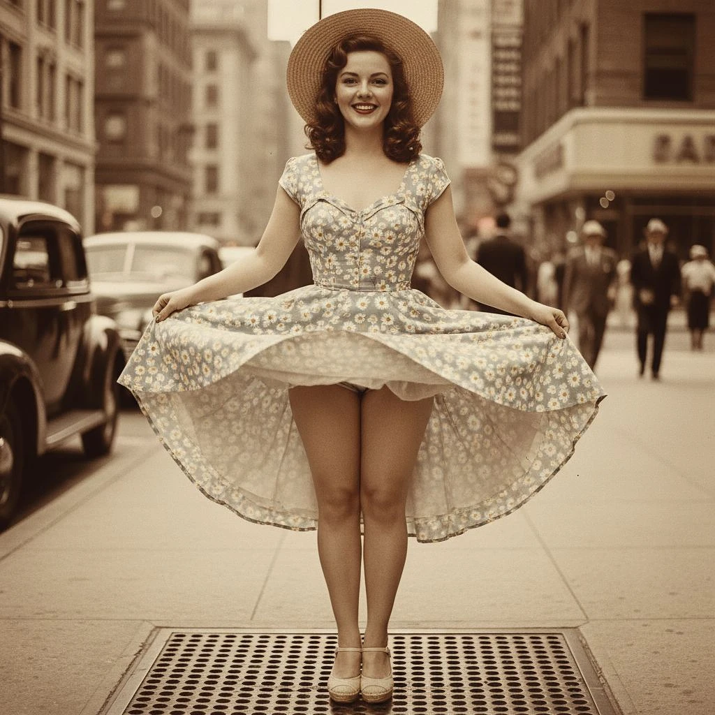 ULTRA 8k LIFELIKE 1940's MARIYLYN MONROE INSPIRED 35 year old PINUP MODEL. Medium height, naturally curvy, in line with pinup models of that time. Pretty face but natural skin with freckles and a dimple on her right cheek, not overly perfect. . Standing over a wind vent blowing her sundress up tastefully. She is wearing a vintage flowy sundress. classic sun hat with long curly brunette hair underneath.