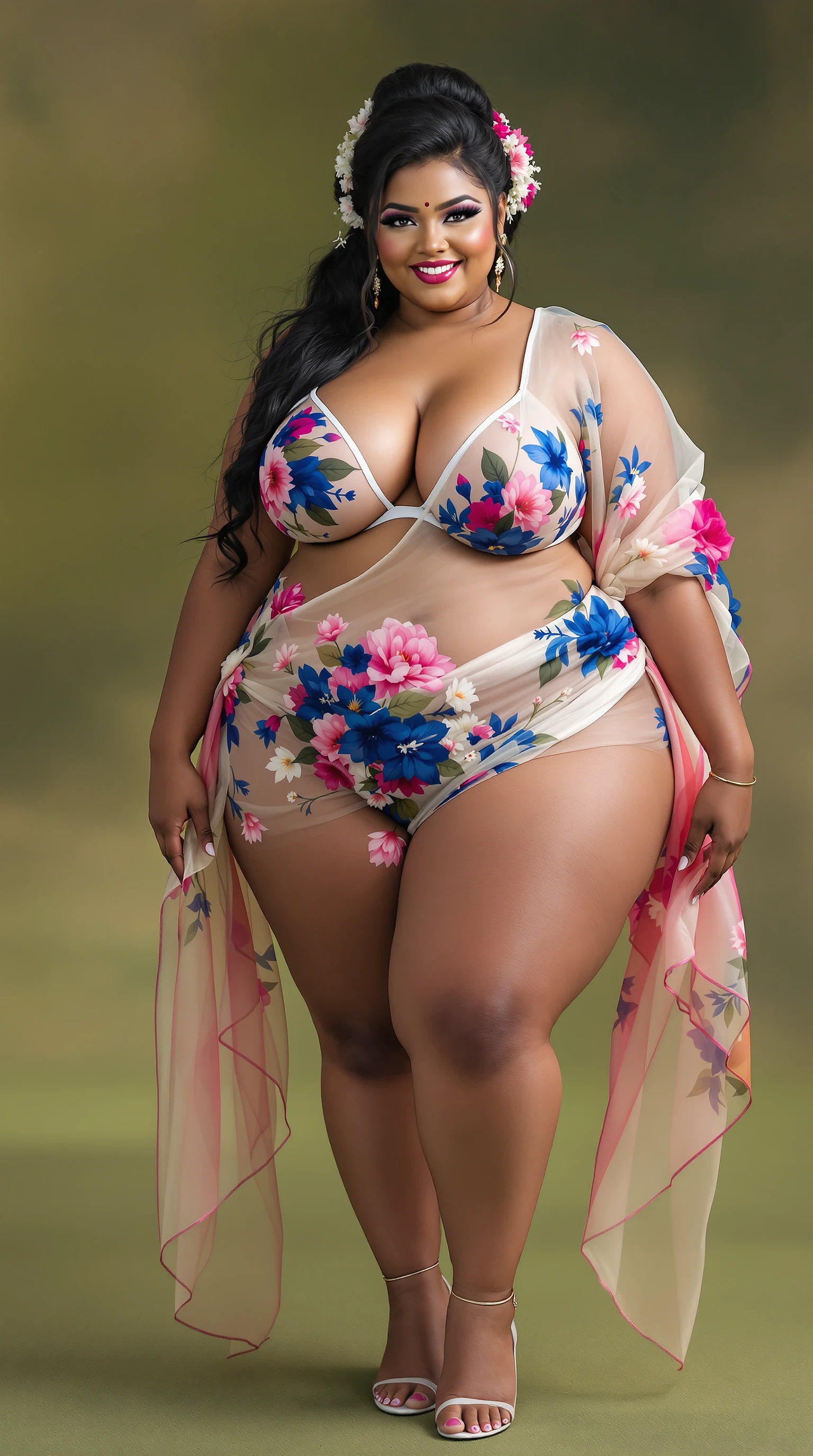 a full front view large puffy boobs ass looking with beautiful black eyes plus size legs with high heels matched color cleavage realistic looking Sexy Indian plus size sexy white Indian woman with sexy beautiful skin color with smiley face a Indian hot and sexy standing on her heart shaped ass butt with blue and pink magenta flowers on her body boobs and legs transparent white and navy blue light pink very thin transparent scarf on boobs and hip see through bra and tiny while panty , capture the delicate contours of her face and the intricate details of her classic hair style black vibrant colors to capture the intensity of the flowers, her hairs styles Gorgeous Cupcake Hued Bun-Style Bridal Hairstyle, she is laughing out loud sexy, she is looking at her back with smiles see through side hip view