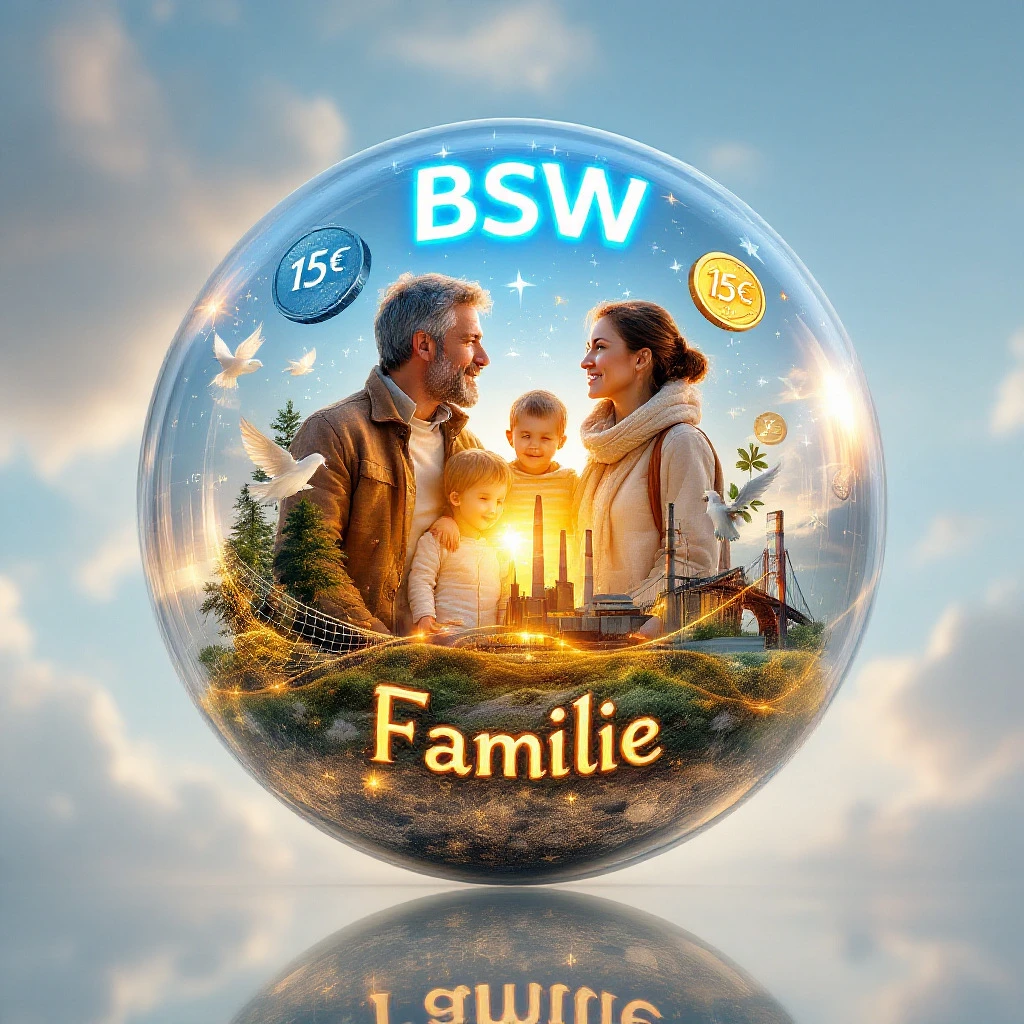 A photorealistic glass sphere floating serenely against a soft blue sky with gentle white clouds, containing a dynamic multi-layered scene: In the center, a German family of different generations stands protectively together, their faces reflecting both concern and hope. Around them, visual metaphors spiral: a broken CO2 price tag being replaced by a glowing industrial factory with clean energy symbols, a golden 15€ coin transforming into a safety net below the family, a dove carrying an olive branch emerging from crossed-out weapons, and a bridge symbolizing migration with a regulated gateway. The scene is bathed in warm, protective light, suggesting social security and stability. A holographic 'BSW' glows in dignified blue letters above the sphere, while 'Familie' shimmers beneath it in a nurturing golden hue. The entire composition reflects through the glass sphere's surface, creating an additional layer of depth and reflection. Technical details: high resolution, photorealistic rendering, volumetric lighting, subtle lens flare, atmospheric depth, hyperrealistic glass refraction.