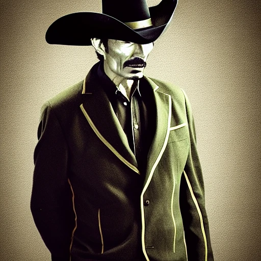 retrato de vaquero, cara de lee van cleef joven de 30 años, piel verde oliva, pelo largo y rubio, sombrero stetson negro, chaqueta negra, imagen digital, arte conceptual, suave, enfoque nítido, ilustración, bigote