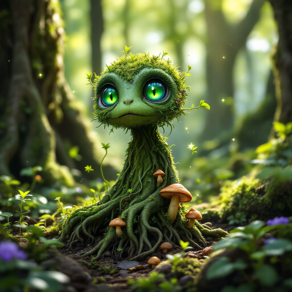 A vibrant, magical saproling creature emerging from the forest floor, its body formed of twisting roots, moss, and budding flowers. Its small, humanoid shape is both delicate and earthy, with glowing green eyes that radiate an innocent yet mystical energy. Tiny leaves sprout from its limbs, and mushrooms dot its bark-like skin, emphasizing its deep connection to nature. The background is a lush forest bathed in soft, dappled sunlight, with thick vines and ancient trees towering overhead. The saproling appears to pulsate with life, as if embodying the essence of the forest itself, surrounded by faint motes of glowing light that dance in the air.