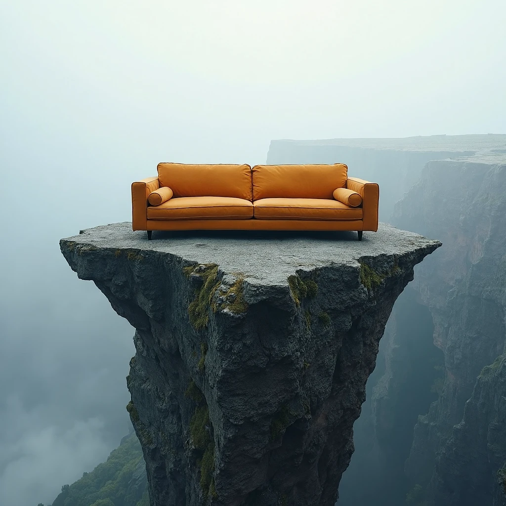 A warm, inviting sofa stands on the very tip of a sharp cliff, its sides dangling over the void below. The jagged rock juts out into the sky, while the sofa stays balanced precisely in the middle. The sense of comfort from the soft cushions sharply contrasts with the breathtaking height and the sheer drop into the misty chasm beneath.