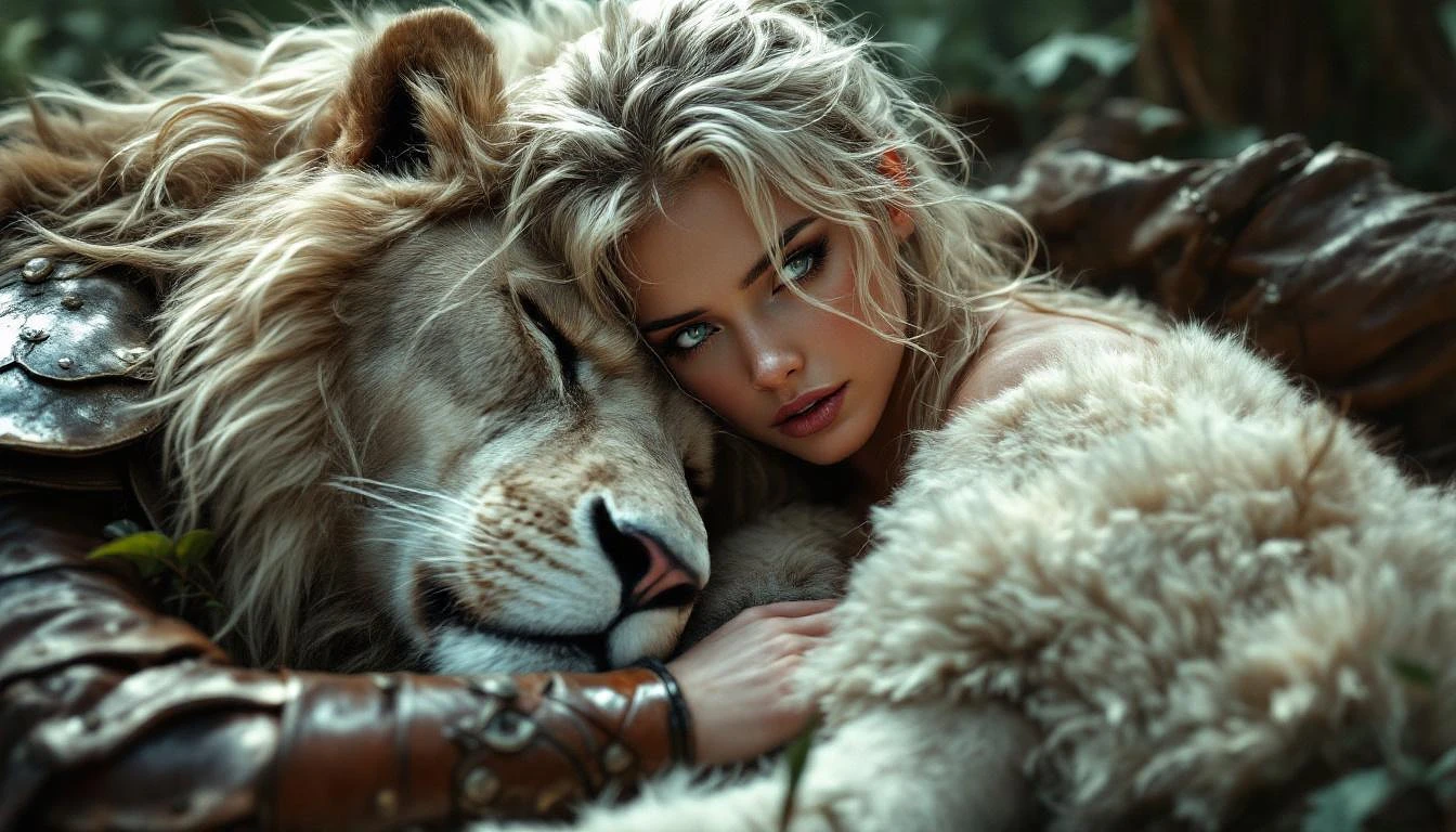 img_1025. cdr Stunning image of a strong and beautiful white european warrioress with fierce white eyes and long tousled blonde sable hair, sleeping contentedly next to her big white war lion. Tan skin, boots and armor of brown leather and fur. Thick rain forest back ground . Volumetric and dynamic lighting. photorealistic detailed maximalist masterpiece. Incredible dark romance fantasy