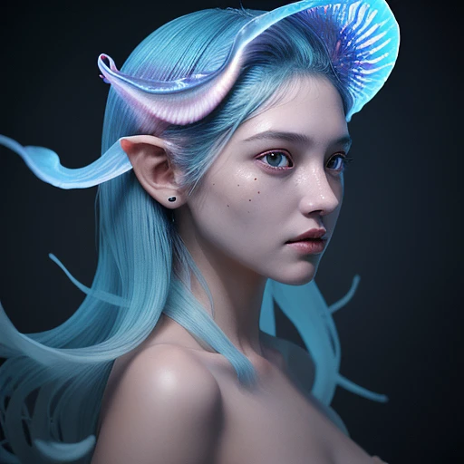 create image of woman, face teenager, style, Goddess close-up portrait ribcagel. jellyfish phoenix head, nautilus, orchid, skull, betta fish, bioluminiscent creatures, intricate artwork . octane render, trending on artstation, t symmetrical artwork. cinematic, hyper realism, high detail, octane render, 8k
