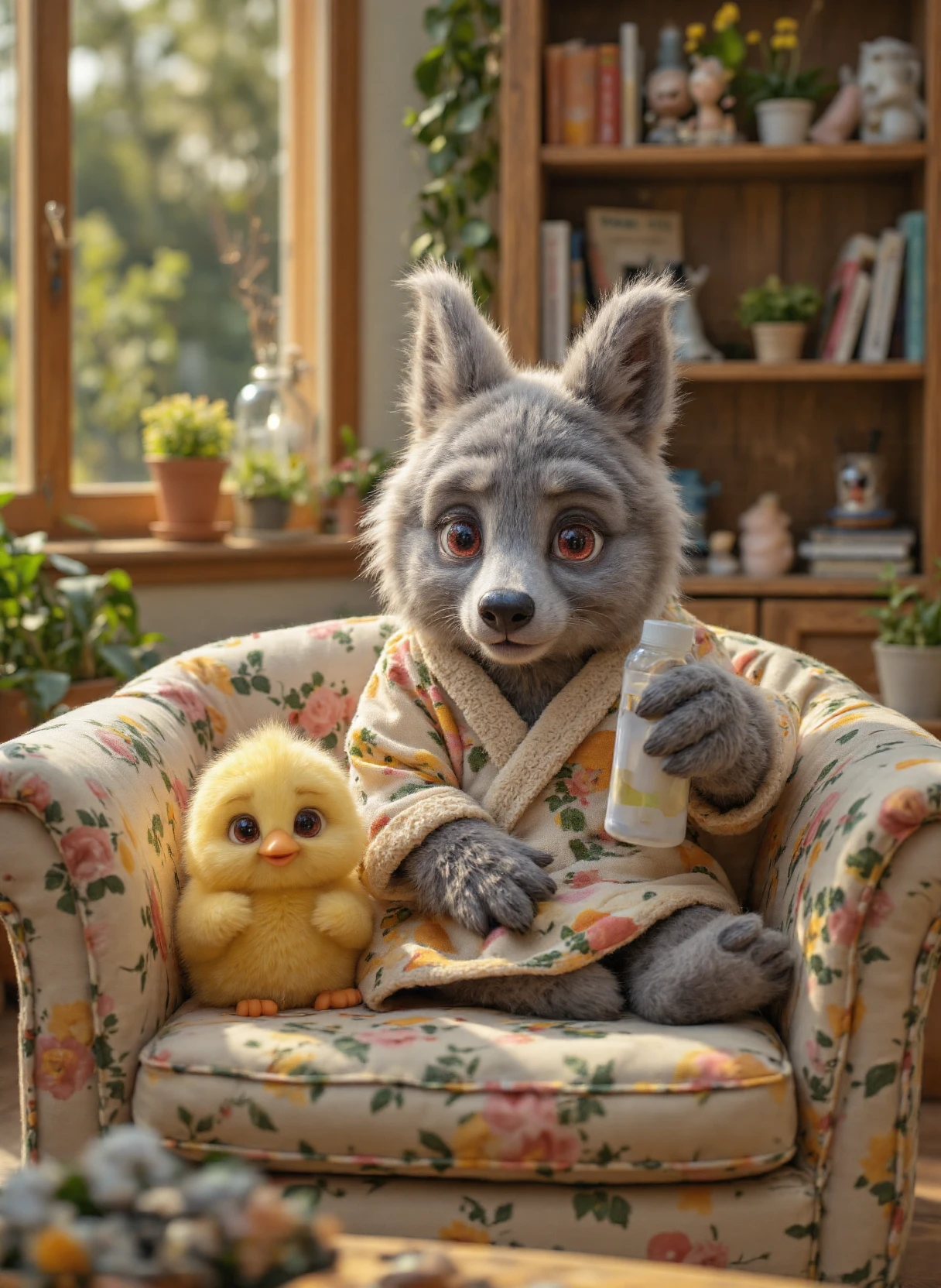 The image depicts a cozy indoor scene featuring two anthropomorphic animated characters ((Pixar Style) ) sitting on a floral colored sofa. The larger character is a gray wolf with fluffy fur, wearing a floral-patterned robe. It has large expressive eyes and is holding a small bottle of medication in its paw. Beside the wolf sits a bright yellow chick with big, round eyes and an open beak, appearing cheerful and curious. The background includes a wooden window frame with a view of greenery outside, suggesting a peaceful setting. On the windowsill, there are potted plants adding to the homely atmosphere. Behind the characters, a bookshelf filled with various items such as figurines and books can be seen, enhancing the lived-in feel of the room. The overall style of the image is whimsical and charming, typical of animated storytelling aimed at children or families.