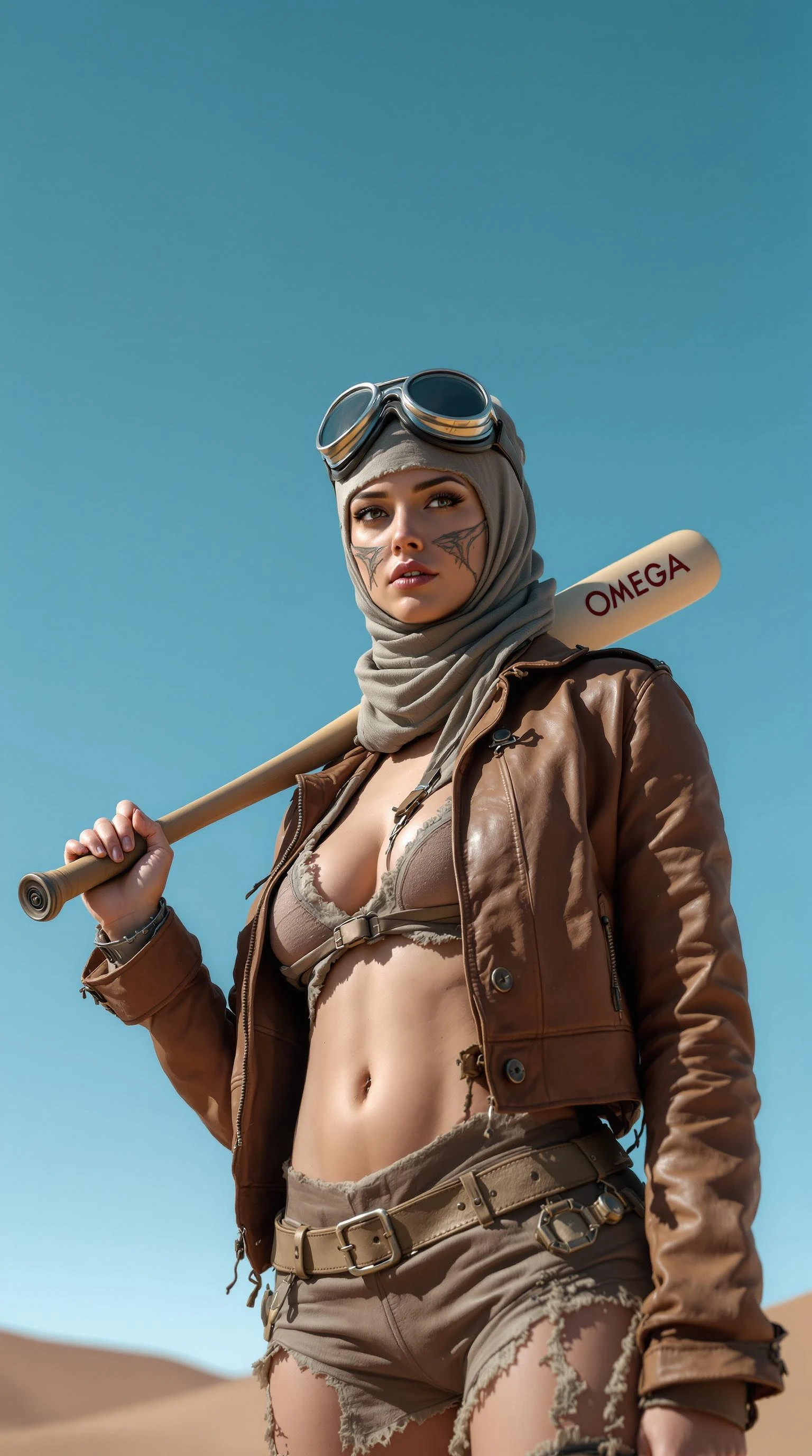 The image features a rugged individual standing confidently against a clear blue sky. They are wearing a worn brown leather jacket and a torn, midriff-baring top. Their face is slightly covered with a scarf, leaving only their eyes visible. vintage goggles on her head. The person is holding a baseball bat with the inscription (OMEGA) over their shoulder, giving off a strong, adventurous vibe. Their outfit appears to be suited for a harsh, post-apocalyptic environment, suggesting themes of survival and resilience. The backdrop of the dessert dunes enhances the sense of openness and desolation, characteristic of a vast, arid landscape.