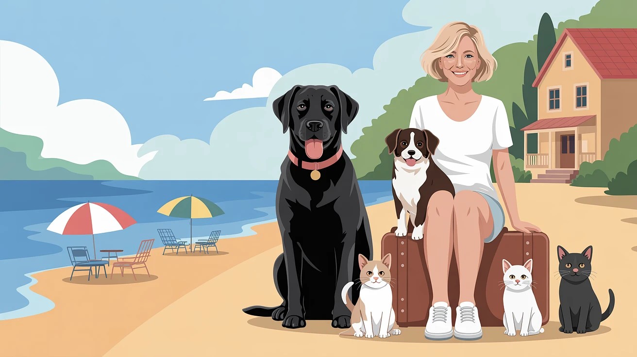 create a banner for a youtube channel: On the left side is a beach with a blue sea and umbrellas on the shore, and on the right, against the backdrop of a village old house, a beautiful sixty-year-old woman with short blond hair sits on a suitcase, to the left of the woman is a black Labrador, and on her lap sits a Pekingese mix dog with a coffee and white color, and around her are three cats