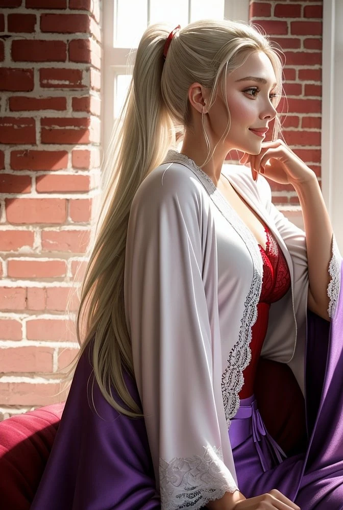 elizabeth olsen close up portrait, smiles discreetly, platinum blonde ponytail hair, dressed in an violet open robe and red lace underwear, sitting on the sofa, window and sunshine on the background