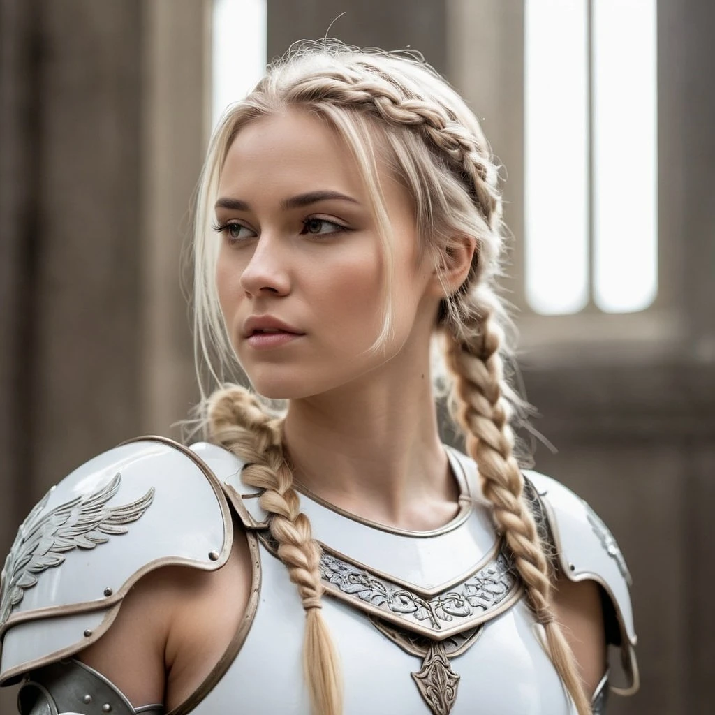an angelic warrior, a beautiful blonde woman with hair in a braid, wearing white armour