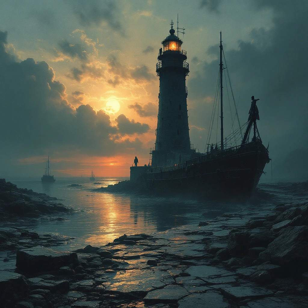 old harbour with lighthouse dungeon synth dark atmospheric melancholic before the sunset next to lighthouse old ship masterpiece a lot of scary ghosts around