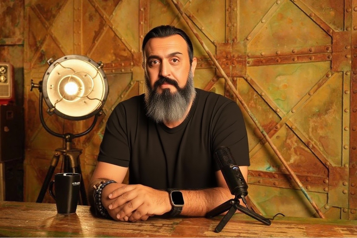 "elements": "Retro spotlight, wooden table, podcast mic"