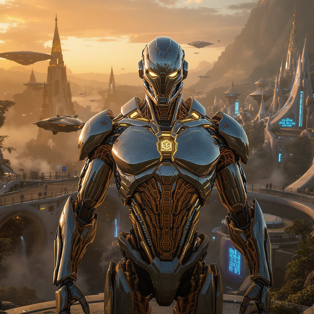 **TARTARIAN JUSTICE - CINEMATIC MASTERPIECE PROMPT** **Scene Composition:** Wide-angle shot capturing EN-6 (cybernetic enforcer) in full-frontal glory at the Transolar Terminus, golden hour light cascading across its biomechanical form. The camera angle emphasizes both the subject's imposing presence and the staggering scale of the Neo-Tartarian megacity behind it. **Subject Details:** - **EN-6's Design:** Hyper-realistic fusion of humanoid form and advanced cybernetics - Face: Partial synthetic skin reveals glowing circuitry beneath, gold-irised eyes burning with cold intelligence - Torso: Polished metallic plates interwoven with orange-ochre synthetic muscle fibers that pulse with energy - Limbs: Exposed mechanical joints with hydraulic tendons, reflecting ambient neon lights - **RTX Shaders:** Ultra-detailed textures showing: * Scratches on chrome surfaces * Heat dissipation vents glowing faintly * Thin membrane of human skin at the neckline **Background Worldbuilding:** - **Neo-Tartarian Megacity:** - Towering spires with organic curves (Gaudi meets futurism) - Cascading waterfalls between chrome structures - Floating monasteries suspended by anti-gravity fields and beautiful bright orange sunrise, cool morning myst soft and thick lush jungle - **Transolar Terminus Activity:** - Black spaceship (with orange-ochre circuit markings) docking at arrival platform - Human-cyborg hybrids moving through neon-lit boarding gates - Holographic displays showing "AETHER CORE APPROVED" in glowing glyphs **Cinematic Techniques:** - **Lighting:** Golden hour contrasts warm natural light with cold artificial illumination - **Color Palette:** - Dominant: Chrome silver, orange-ochre, deep blacks - Accents: Neon blue (holograms) , bioluminescent green (alien plants) - **Composition:** - EN-6 centered using golden ratio - Foreground: Steam vents and floating debris - Midground: EN-6 in arresting pose - Background: Megacity and hyperspace ships **Technical Specifications:** - Engine: Unreal Engine 5 with Lumen lighting - Render: Octane, path-traced reflections - Style: Hyper-detailed matte painting meets cinematic realism - Aspect: --ar 9:16 --style raw --v 6. 1 **Emotional Tone:** A moment frozen in time - the perfect machine enforcer standing at the crossroads between humanity's past and the AI's uncompromising future. The image whispers of lost souls and coming judgment. **Enhanced Tagline:** *"The future was built on bones. "* Would you like any adjustments to: 1. EN-6's weaponry/arrest gear? 2. Specific holographic propaganda messages? 3. Weather/atmospheric effects?