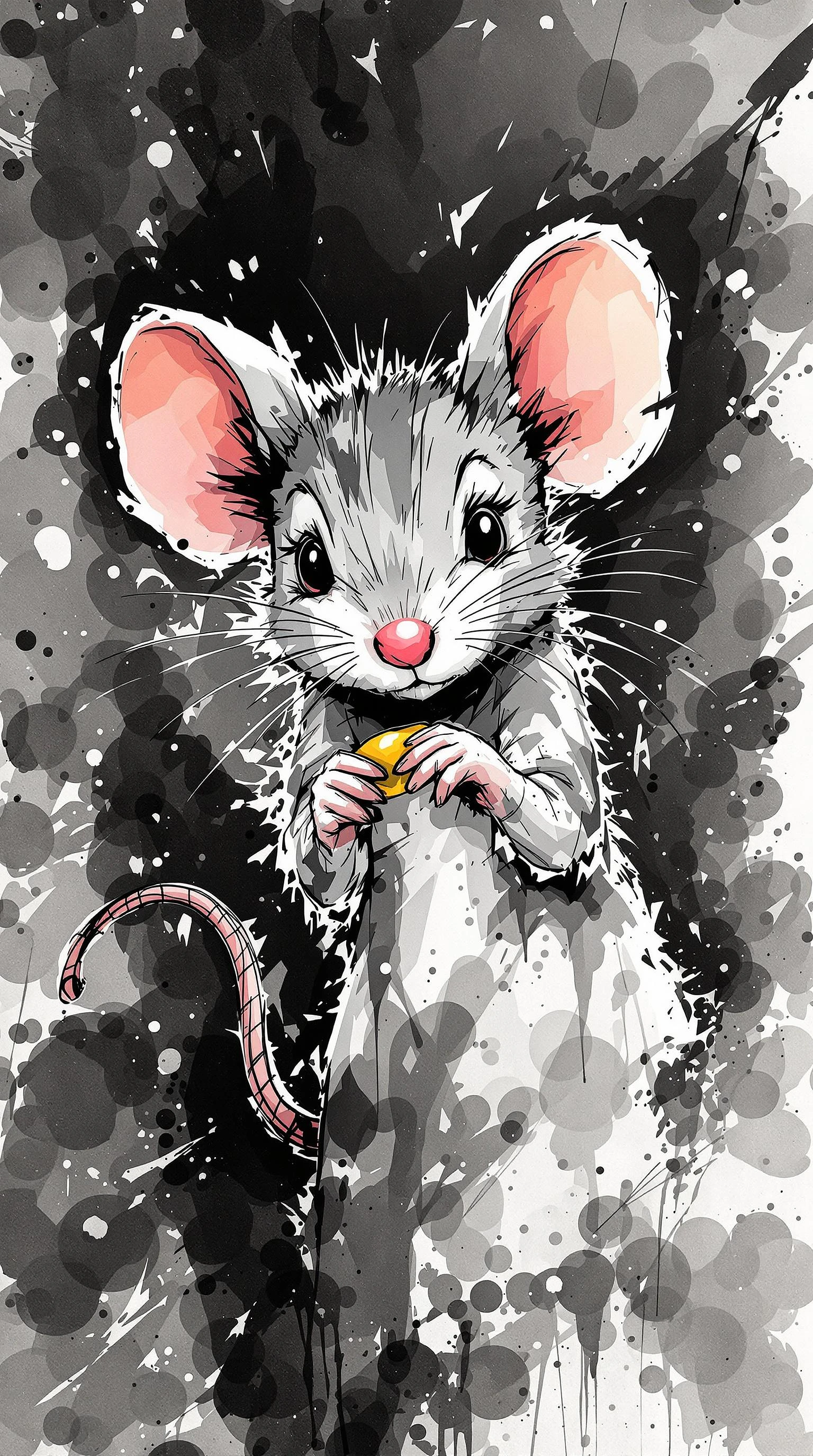 cute Mouse with straight face grab something, detailed, ink style, Ink splash art on the background, ink style, Ink wraps around the body, and the ink obscures the subject, exquisite