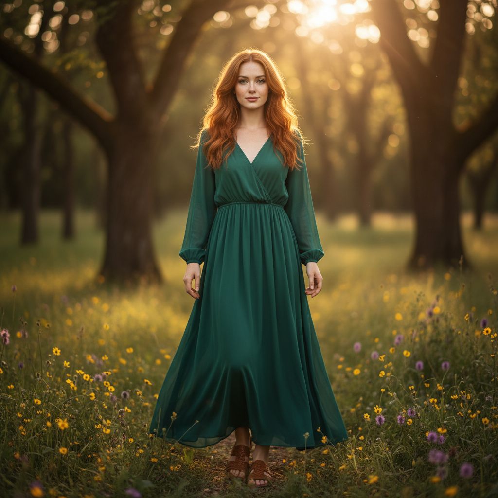 Full Body View, Full Body Image, 29-year-old woman, ginger hair in soft waves, porcelain-white skin, light freckles around nose, striking green eyes, heart-shaped face, high cheekbones, gentle smile, natural beauty, photorealistic, cinematic lighting, ultra-detailed, DSLR depth of field, professional FULL BODY , cinematic framing, 16:9 aspect ratio, wide shot, ultra-realistic photography, Show full body view