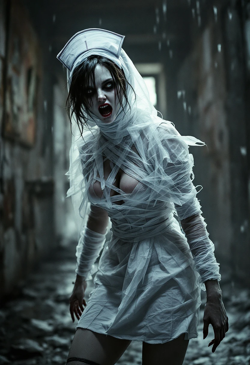 legendary photoart dark and terrifying themes, evil nurse from Silent Hill, in a short uniform with a deep neckline, gauze wrapped, frozen in a bizarre pose, darkfantasy, beautiful horrorcore, expressive, epic scene, cinematic, 32k, UHD, concept by Artificial Nightmares --niji 5 --style expressive --ar 800:1600 --upanime
