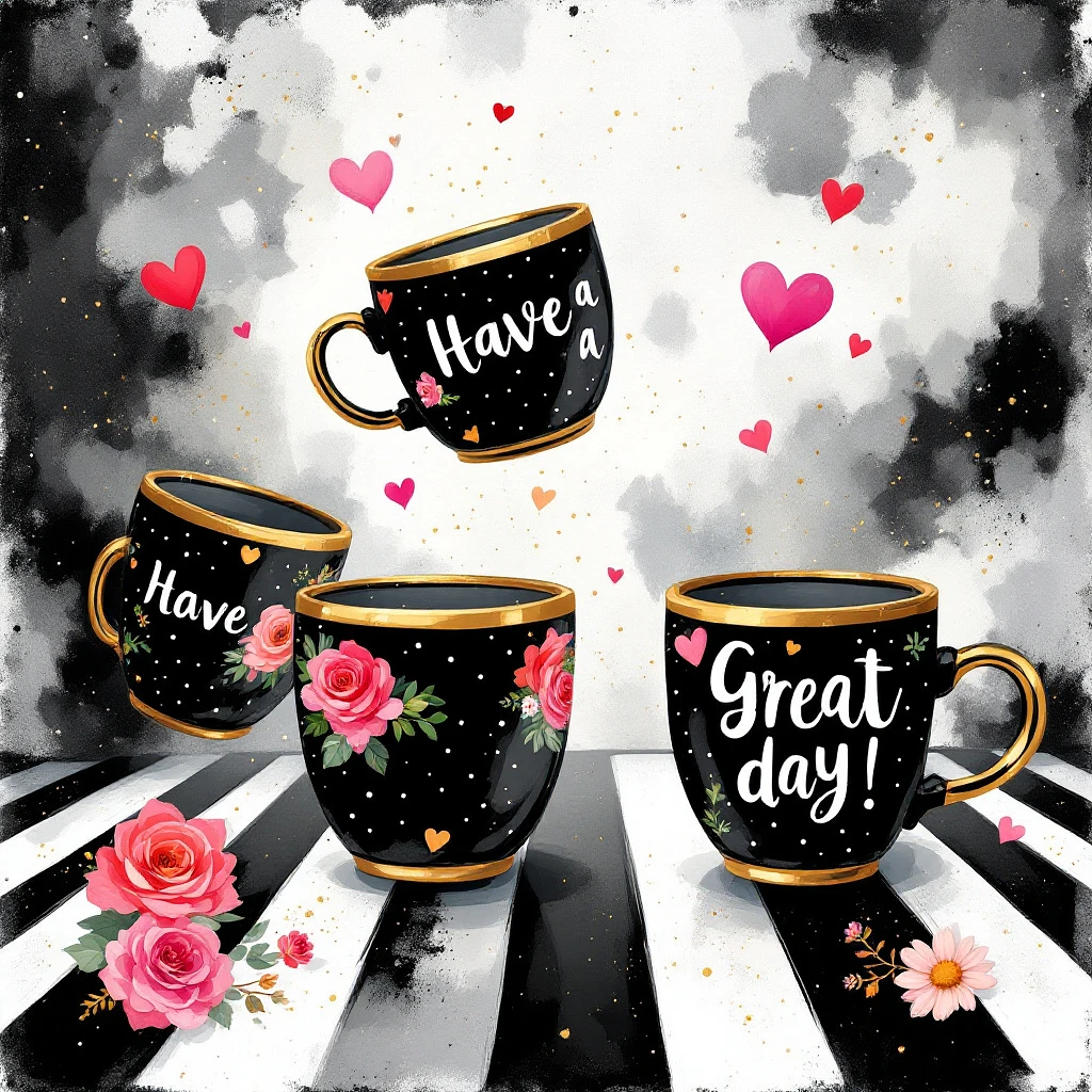 A whimsical and enchanting illustration featuring four gold-rimmed black polka dot felt mugs, each displaying a motivational phrase. 'Have' 'A' 'Great, ' and 'Day! ' float gracefully in mid-air, defying gravity. The background is a captivating blend of black and white hues, reminiscent of an abstract painter's palette, creating a dreamy atmosphere. The mugs are adorned with vibrant flowers, hearts, and roses, adding charm and playfulness. They rest on a striking black and white striped surface, emphasizing the visual impact and balance. This typography-inspired artwork exudes an uplifting and dreamy mood, designed to inspire positivity and motivation. The piece showcases the artist's mastery in painting, typography, and illustration, resulting in a captivating and imaginative composition. , typography, painting, illustration