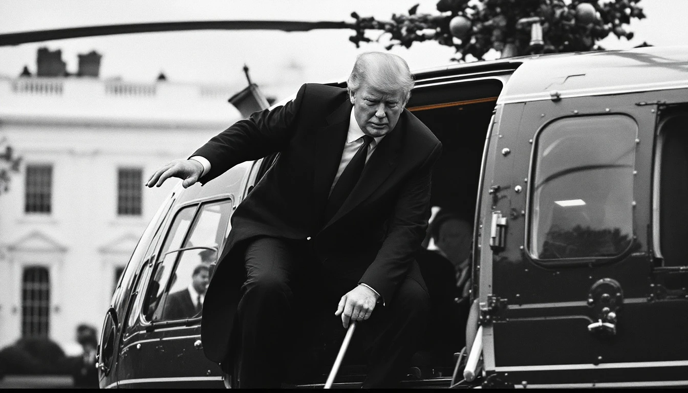 Donald Trump in place of Richard Nixon in the iconic photo of Nixon leaving the White House for the last time on his helicopter after being impeached