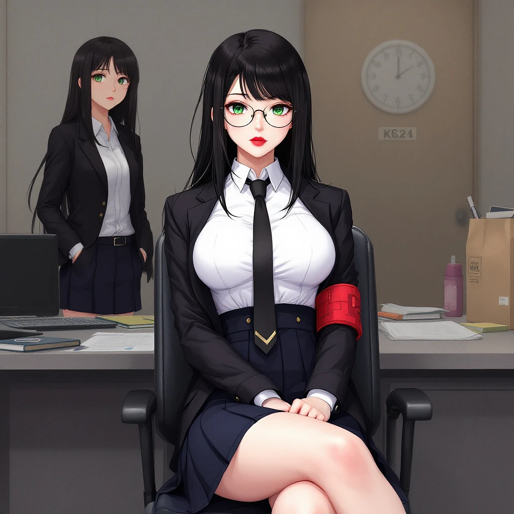 anime, woman, black hair, long hair, green eyes, red lips, white shirt, black tie, black blazers, short dark blue skirt, highschool skirt, white socks, black shoes, standing at an office, big chest, sitting on a chair, sitting with legs crossed, glasses, red armband around the arm, detailed