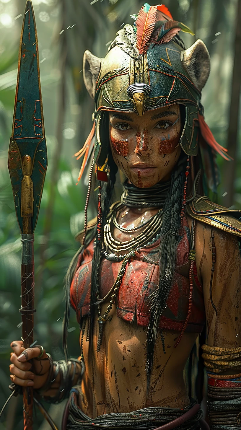 Indigenous woman warrior, holding an alien bow and arrow, helmet with macaw feathers, chest armor, detailed dense forest background, mega realistic, reflection mapping, intricate design and details, dramatic lighting, hyperrealism, photorealistic, cinematic, 8k, unreal engine