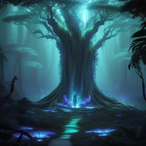 (Movie:Avatar) , landscape of the Bioluminescent Forest of Pandora, Pandora's flora and fauna emit a supernatural glow casting a mesmerizing and ethereal light over everything, Supernatural wonders, Alien Moon, Alien Planet, Paranormal phenomena, Enchanting and magical atmosphere, Towering trees with massive trunks and wide canopies dominate the landscape, Creatures like Woodsprite have vibrant, glowing patterns on their skin, ((Na'vi race, a male) , A tall, slender, (blue-skinned body:1. 2) ), (body focus) , (Masterpiece, professional work, award winning) , ultra realistic illustration, biochemical android steampunk, ultra detailed steampunk, hyper realistic color splash art, Unreal minimalism with octane render, depth of field with bokeh, (Epic composition, epic proportion, epic fantasy) , cinematic lighting, volumetric lighting, vibrant color, RAW photo, photography, sc-fi, UHD, DSLR, 8k