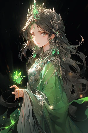 A mysterious manga character in a mystical crystal necklace, wearing elegant flowing robes, holding a nature-patterned bow, enchanting green eyes, epic wind and earth bending shot, Coral art, super high detail --ar 2:3 --niji 5