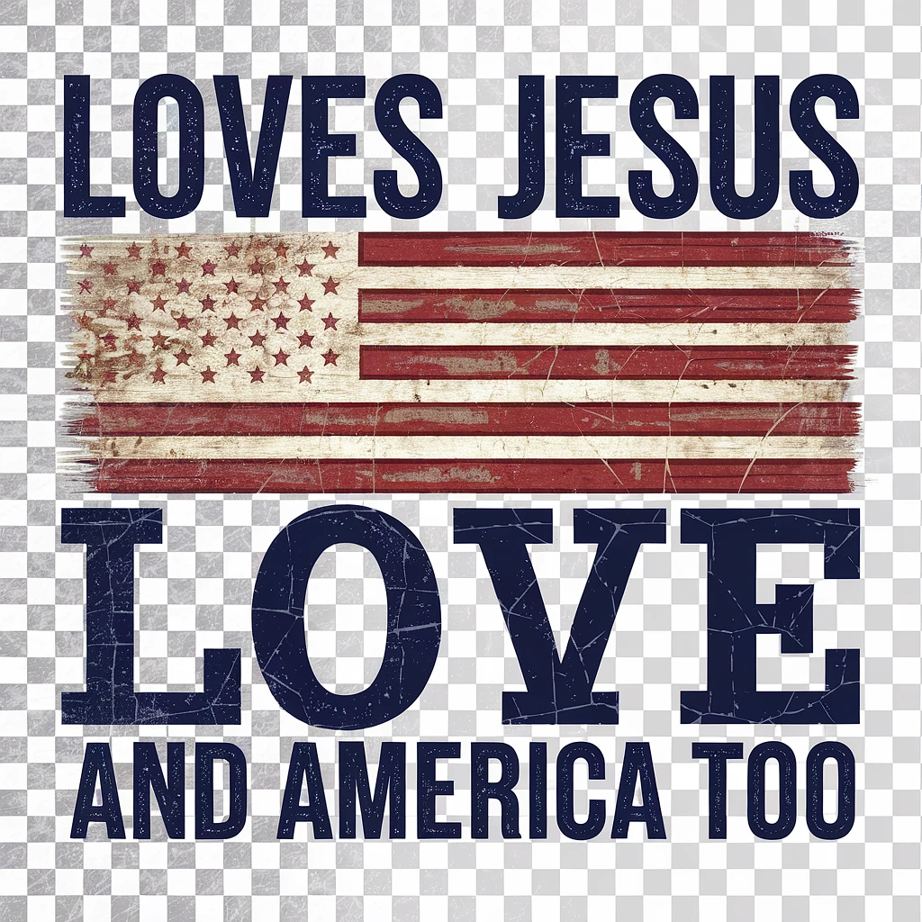 Create a vintage, distressed design on a transparent background. The design should feature the bold, uppercase text "LOVES JESUS" at the top in dark blue, using a strong sans-serif font. Below "LOVES JESUS", place a grunge version of the American flag, with faded red and white stripes and stars in the top left corner. Under the flag, place the word "LOVE" in the same dark blue, with six faded stars arranged in a row beneath it. At the bottom, place the text "AND AMERICA TOO" in dark blue, using the same bold, uppercase font as the other text. The overall design should have a grunge effect with cracked textures on the flag, stars, and text, giving it a retro and patriotic feel.
