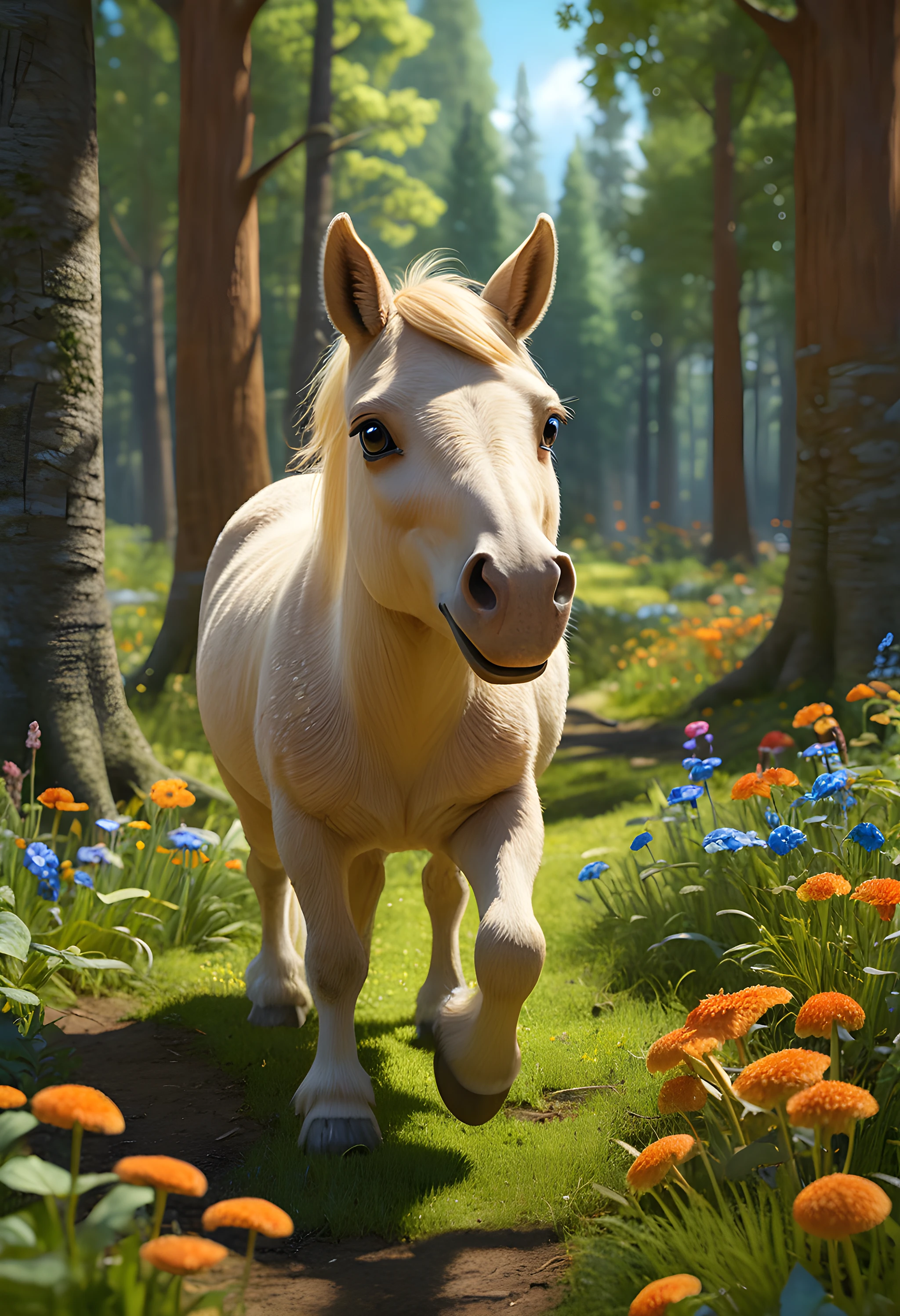 A lively palomino pony prances through a colorful clearing in a forest. Vivid greens, blues and oranges surround the playful young equine's spotted golden coat, exaggerated features reminiscent of Donkey's round black eyes enhance an expression of joyful curiosity. Textures of the grass, wildflowers and trees are lush and finely detailed yet cartoonish, invoking the animated aesthetics of Dreamworks. As the horse explores its magical surrounds, sniffing puffball mushrooms and nibbling popsicle-colored berries, an atmosphere of friendly absurdity and fun is conveyed, typical of the Shrek universe where amusing anthropomorphic and photorealistic qualities blend seamlessly. Rendered as if a lovable sidekick joining Shrek's next madcap fairy tale adventure