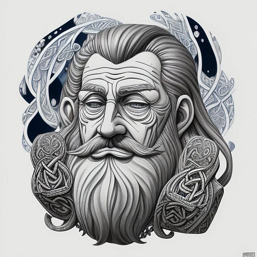 the head and shoulders of an elderly man with a beard, in the style of nautical surrealism, intricate compositions, ink and wash, psychedelic dreamscape, celtic art, white and gray, cubist street art --ar 72:107 --stylize 750 --v 6