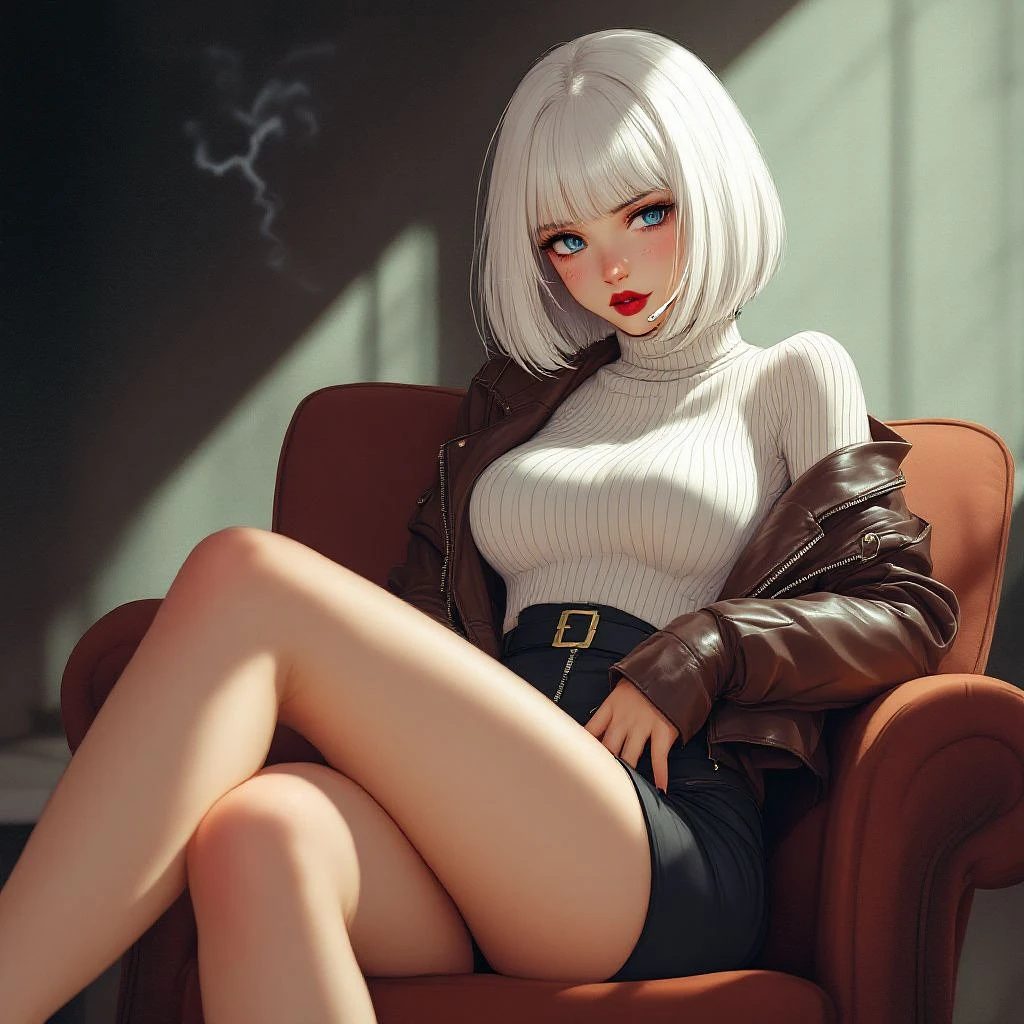 Bad anatomy, extra legs, extra hands, extra fingers, black stockings, long hair, extra cigarette, smiling, particles on face, realism