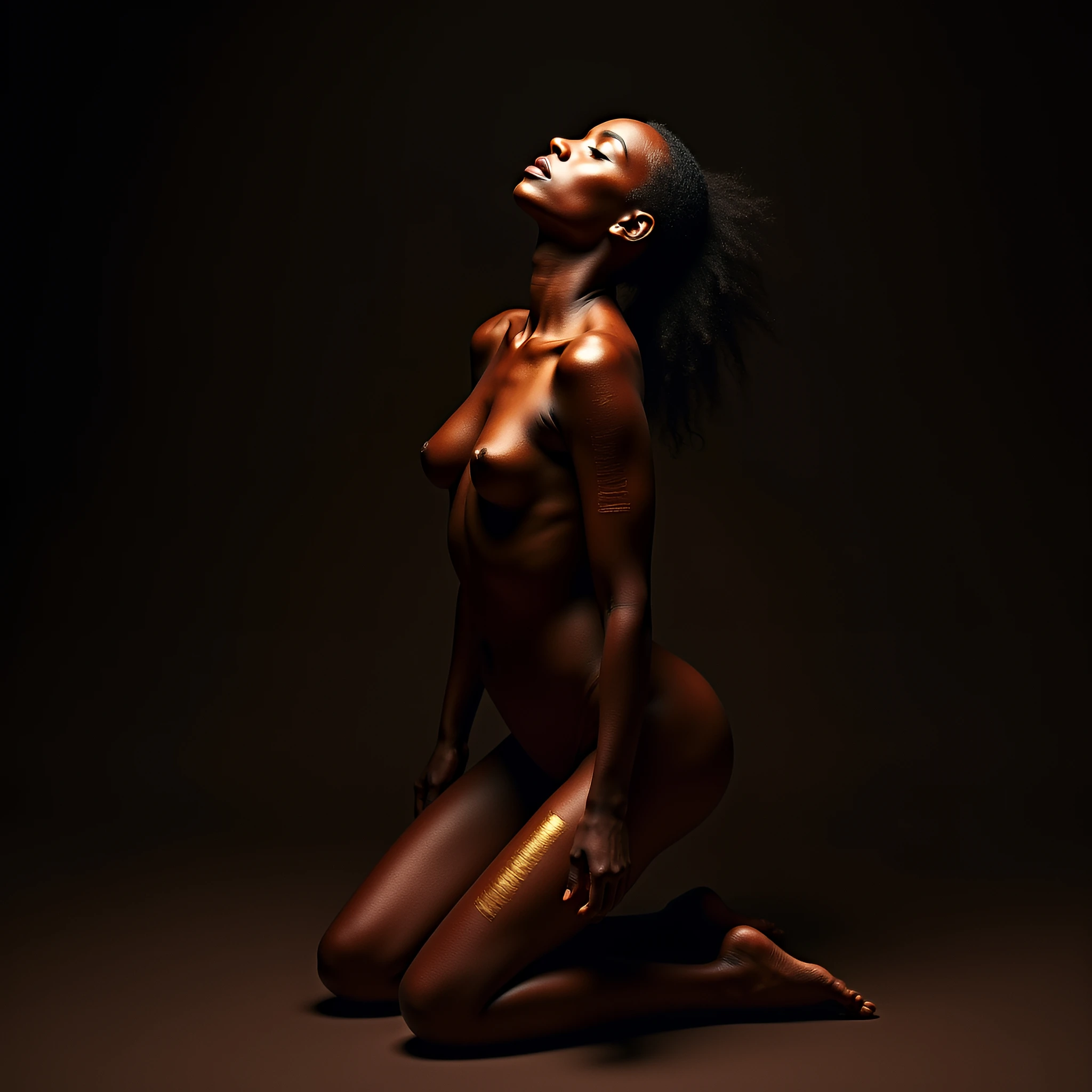 artistic nude with the model painted in metallic copper, kneeling with head tilted up, dramatic low lighting from behind, tribal and powerful energy, Canon EOS R5 + RF 85mm