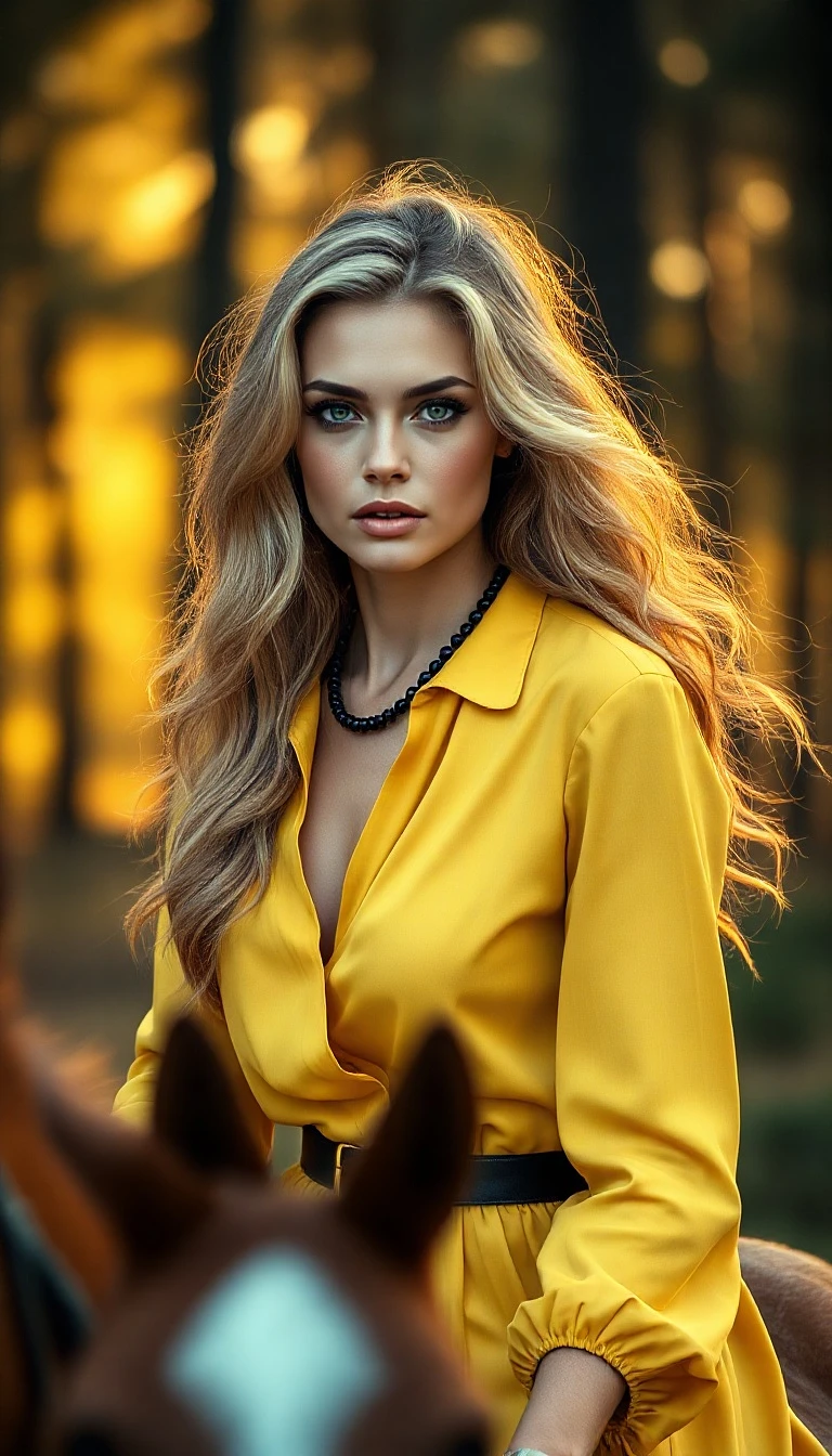 "Full-body portrait photograph: a stylish supermodel in her early twenties rides an Arabian horse in a forest. Golden blonde hair, sun-kissed skin, and striking green-blue-silver eyes. She wears a champagne yellow outfit and black pearl jewellery. Warm, soft lighting, blurred golden hour background. Colours: browns, beiges, muted greens. Style: Fine art photography. "
