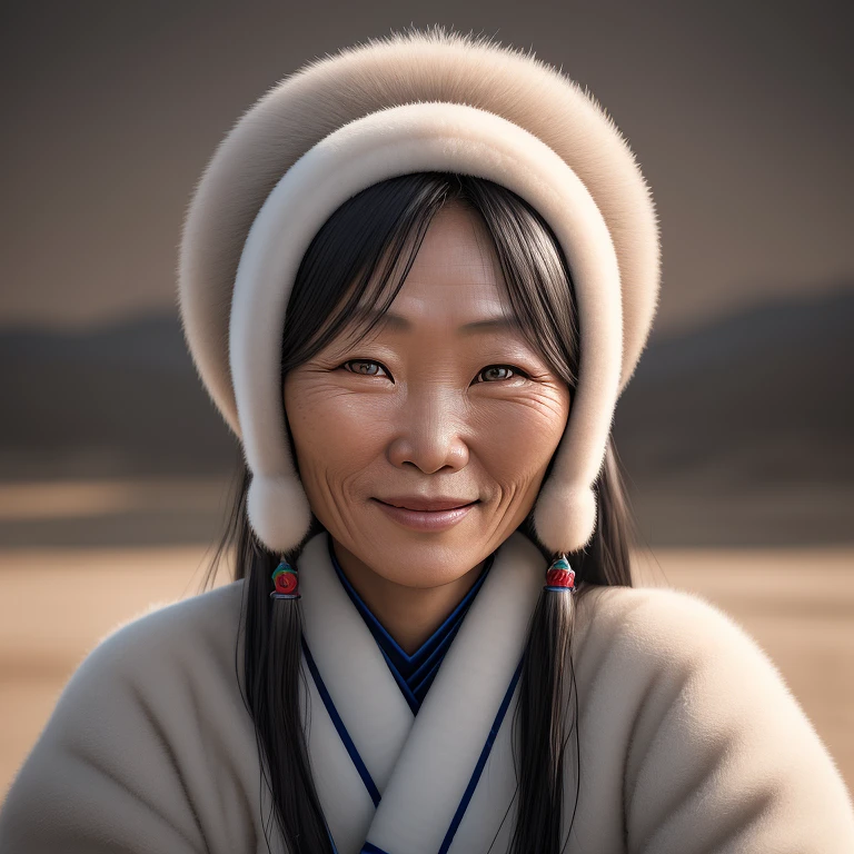 hyper realistic headshot photo of a 40 year old mongolian woman, slim, skinny, looking into the camera, smiling slightly, ultrarealistic, soft lighting, 8k