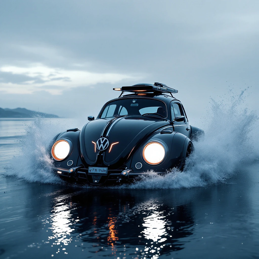 Volkswagen New Beetle , car driving through water, in the style of futuristic spacecraft design, eerie landscapes, ocean academia, elaborate spacecrafts, somber mood, nikita veprikov, lovecraftian --ar 4:3 --v 6. 0