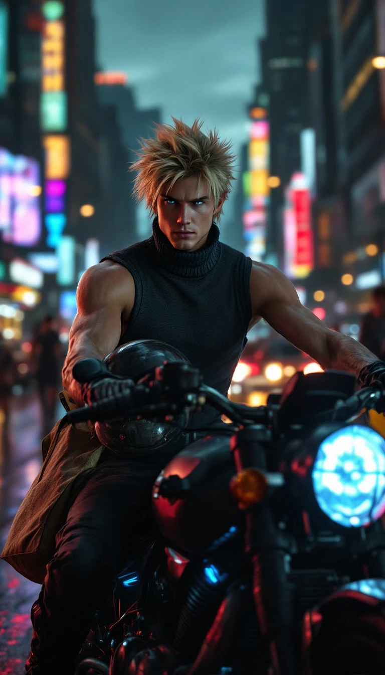 A photorealistic, documentary-style candid shot of a rugged young man with spiky blonde hair and piercing blue eyes, a real person inspired from Cloud Strife from Final fantasy VII, rides a sleek, black motorcycle through a bustling city at dusk. His face is stoic and focused, with a hint of quiet determination. The neon lights of the city reflect off the wet pavement, casting a moody cyberpunk glow around him. He wears a charcoal colored tight fitting knitted turtle neck sleeveless tank top, revealing his lean but well defined arms. His fingerless gloves holding a helmet under his arm as he is about to wear it . A large, pizza delivery bag is secured to the back of his motorcycle. The powerful bike has a futuristic yet industrial design, with glowing blue accents along the engine and wheels. The background are filled with traffic and pedestrians—streaks of red and white headlights cutting through the rain-soaked streets, as towering skyscrapers loom overhead. The scene has a cinematic, high-contrast lighting style, with deep shadows and dramatic highlights emphasizing the intensity of the ride. The overall vibe is one of, solitude, and an unspoken mission, as if he’s carrying more than just a package—he’s carrying a purpose. The overall composition is hyper-detailed and cinematic, creating a immersive and visually captivating scene, photorealistic, ultra-detailed, cinematic lighting, candid shot, 8K resolution, realistic textures. . The model features and environment should be based off a real person and a real place.