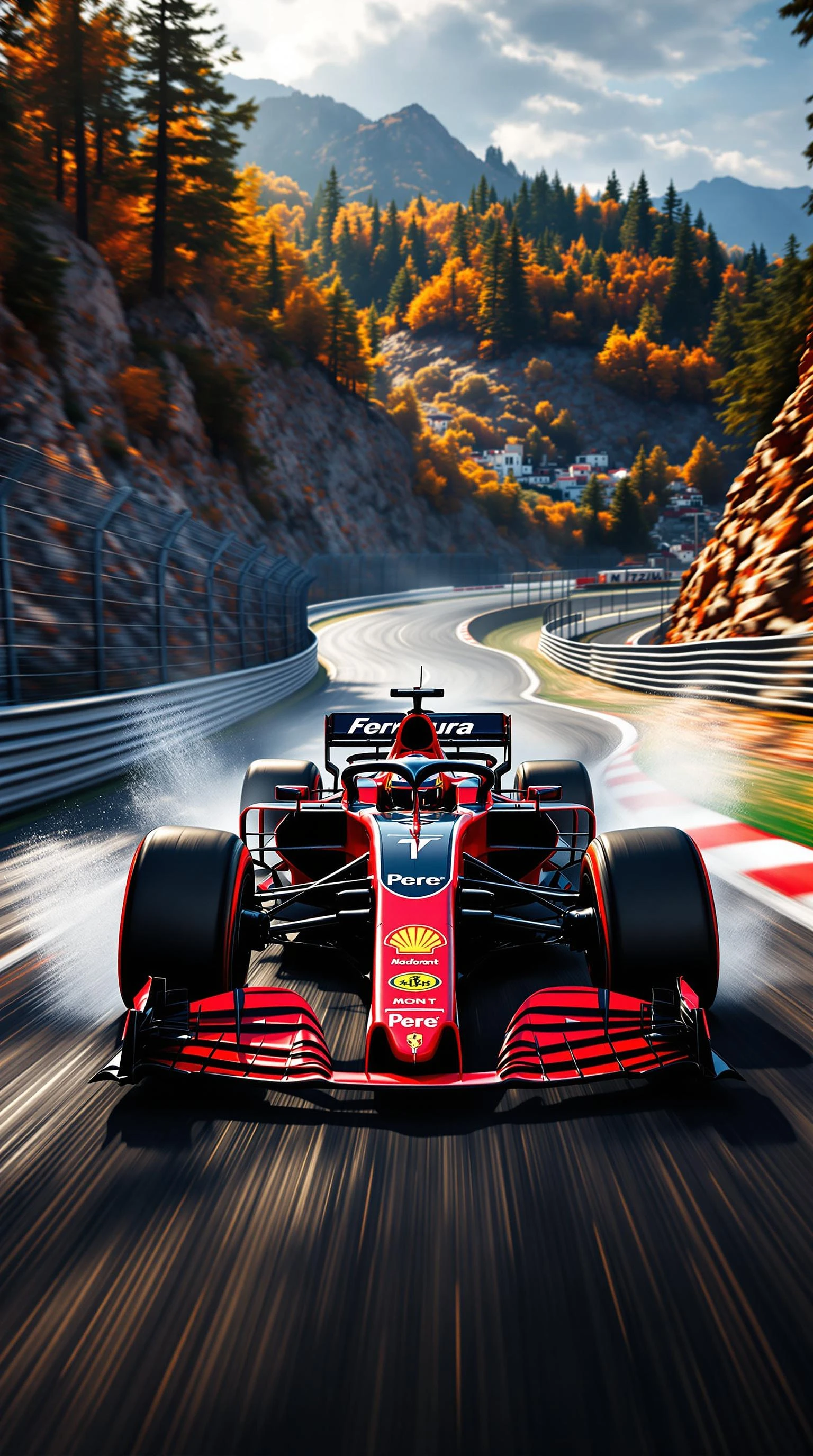 un coche de formula 1 de color negro y rojo corriendo a gran velocidad por un circuito de Mont Melo con el nombre de la escudria "Pere"