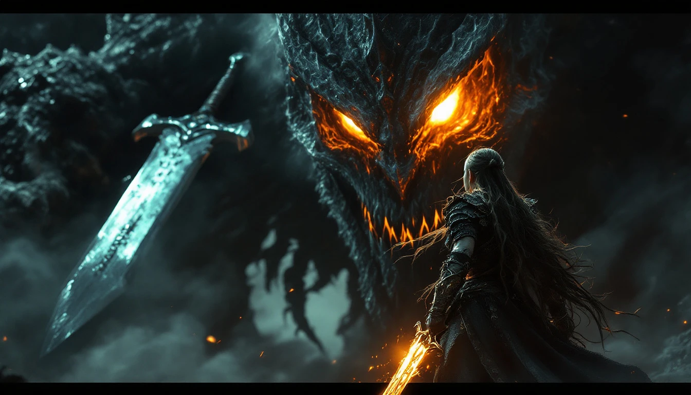 In this captivating dark fantasy cinematic photo, a powerful barbarian woman dressed in light chainmail armor stands tall and resolute, waist narrow. She faces a colossal final boss with an enormous menacing sword. The fearsome creature looms over her, its eyes glowing ominously and emitting wisps of smoke. The atmosphere is tense and foreboding, with an air of danger and heroism. The colors predominantly feature dark tones, yet the gleams of steel and fire create a sense of tension and anticipation, as if the outcome of this epic scene hangs in the balance. Runes on the blade of her swords are glowing with eldritch energy. , cinematic, photo