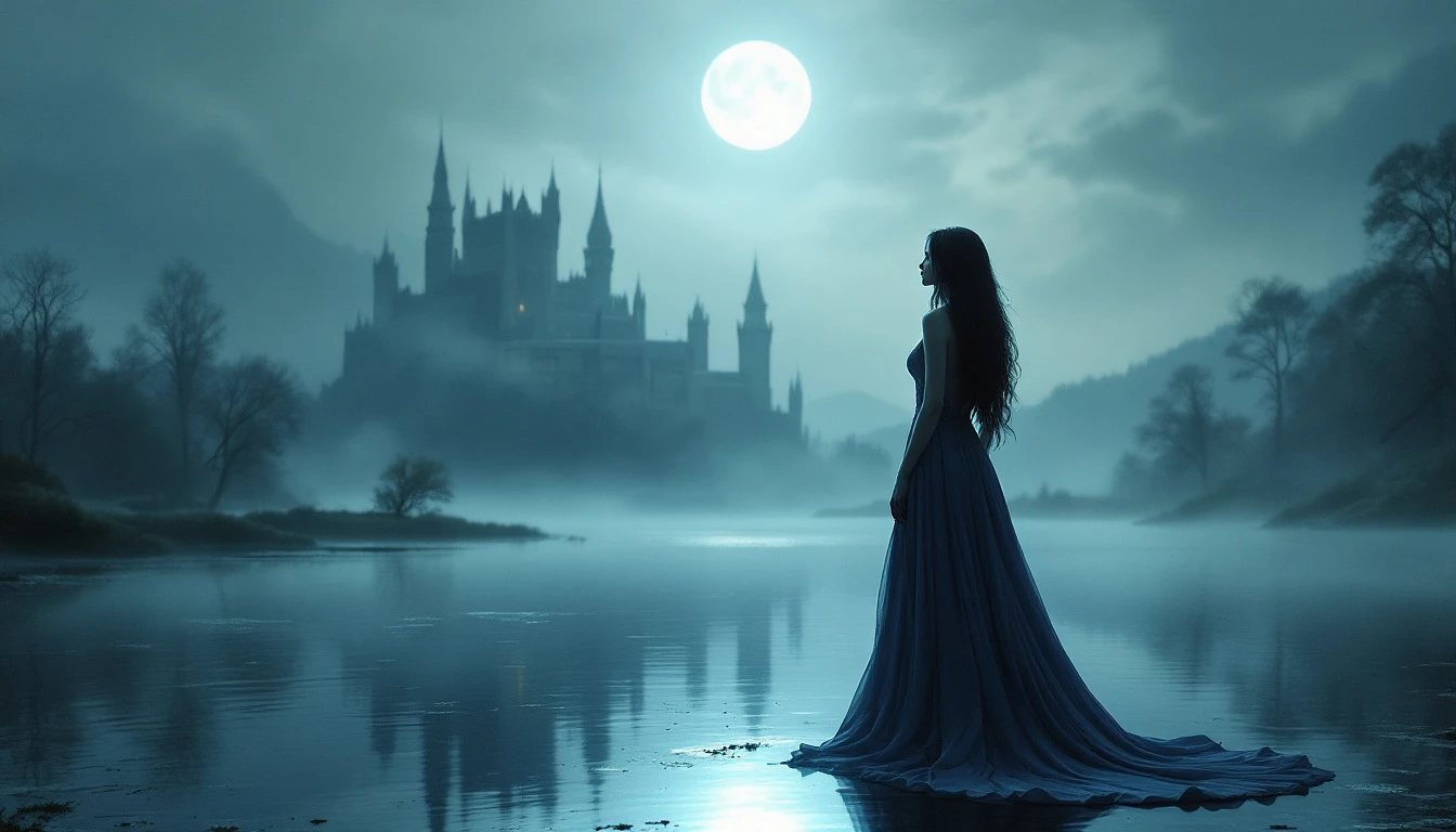 a woman in a flowing gown standing on a misty lake in front of a large castle and full moon. Long dark hair cascades down her back, Silhouette of a slender figure, Floor-length gown with a train flowing behind her with No visible jewelry or makeup. She is Standing with her back to the viewer while Gazing up at the full moon. In the background a Large castle with spires and towers in the distance can be seen. A Full moon is shining brightly in the sky. Misty lake with a few trees and bushes. The image is a Wide-angle camera perspective emphasizing the vastness of the scene. Soft, dreamy lighting with shades of blue and gray. The Style reminiscent of a fantasy or romance novel cover. Camera used likely a digital SLR with a wide-angle lens.