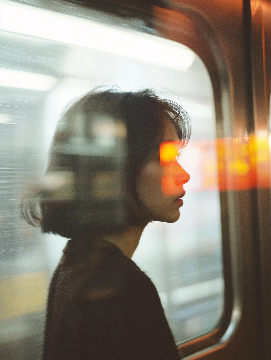 A blurry photograph of a woman standing in front of a subway car, captured by a Hasselblad X2D 80mm lens at f/4. The natural light creates soft shadows with minimal contrast. The focus is on her reflection on the glass as she stands waiting for the train to pass. The colors should be muted pastels. She has short hair and is wearing dark , looking out into the distance, --v 6. 1 --style raw --ar 3:4 --q 2 --s 100