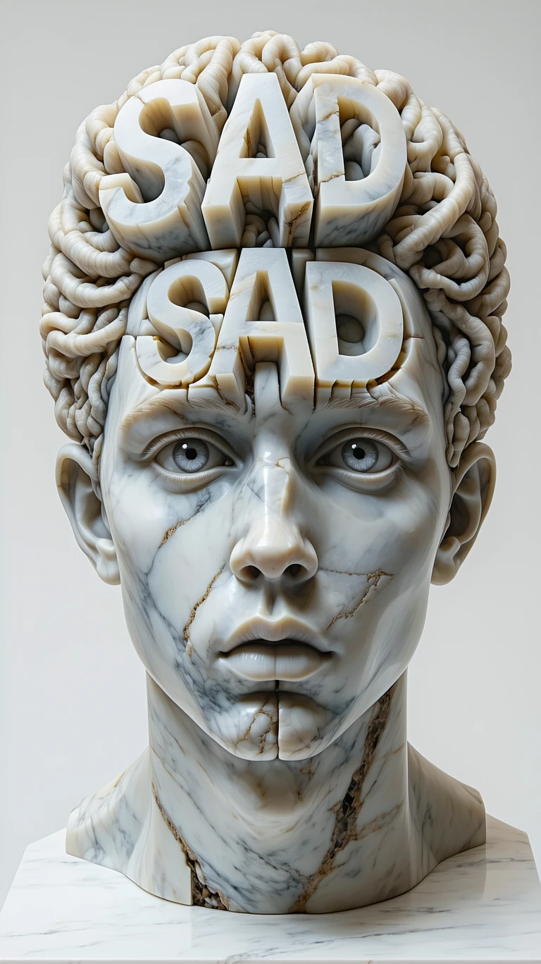 Microscobic view of a marble hair on a statues head in shape of typography “SAD”,