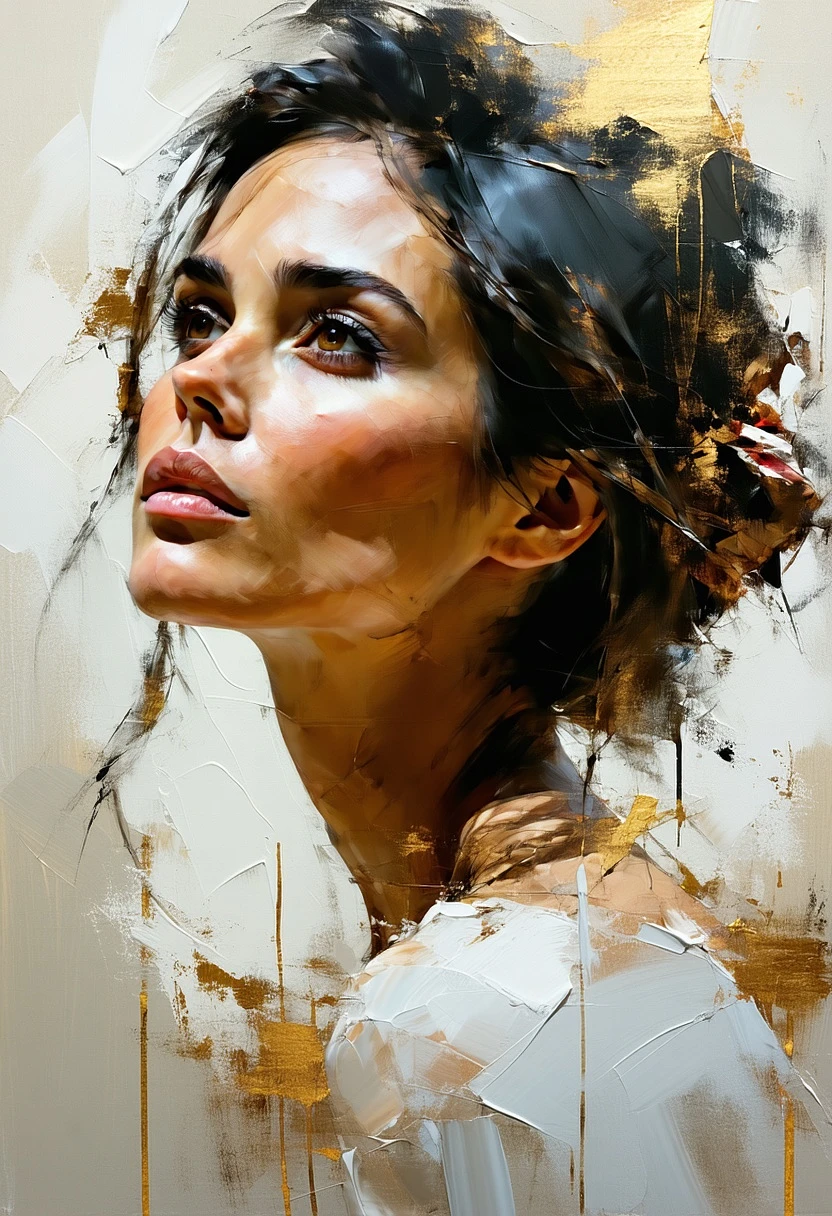 a painting of a woman, in the style of brushstroke-intensive portraits, cinematic elegance, golden light, flowing brushwork, multilayered realism, feminine themes --chaos 75 --ar 1:2 --profile rsy6uq9 --stylize 750