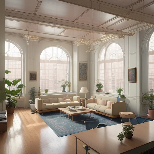 High resolution photography interior design, dreamy New York Trading floor, 4 traders, conversation pit, wooden floor, small windows opening onto the garden, bauhaus furniture and decoration, high ceiling, beige blue salmon pastel palette, interior design magazine, cozy atmosphere; 8k, intricate detail, photorealistic, realistic light, wide angle, kinkfolk photography, A+D architecture