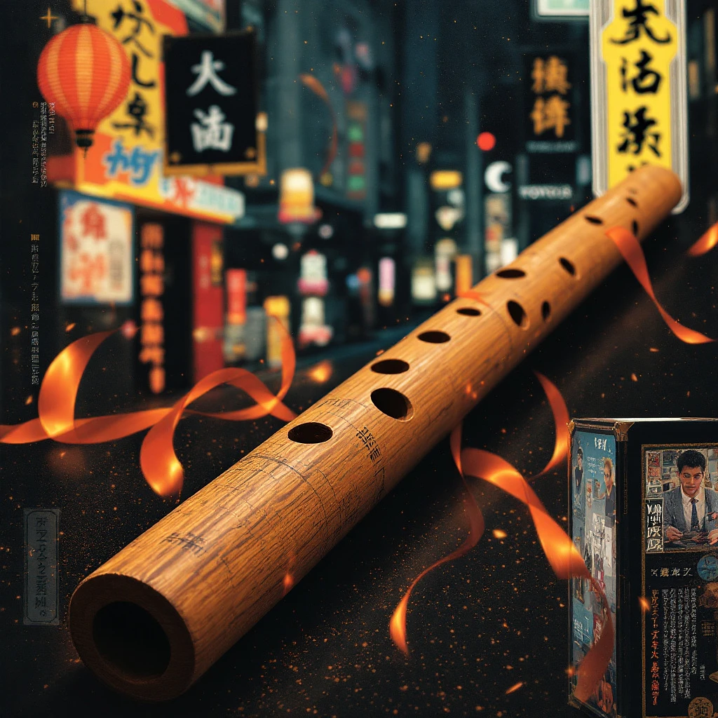 a single peruvian wooden flute in a Hyperralistic indie movie poster in Tokyo