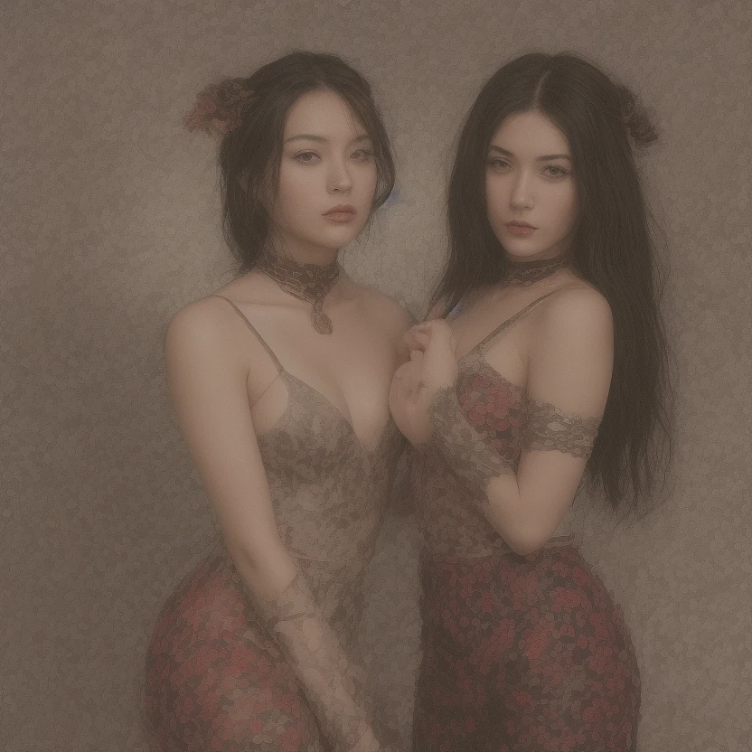Two beautiful alluringly seductive Japanese women, sit, in a serene field of red roses, in an embrace, right hand of each on the other's hair, each with long jet black hair, black, gold and silver intimately ornately detailed halter leather top and bottom embellished with red gemstones, steel black iron bands encircle each of their necks, wrists and ankles adding a touch of mystery. Exquisite, photorealistic face, precise cosmetic features. Stunning, detailed eyes. Full, luscious lips, radiant skin. Hip-length luscious black hair. cinematic, high detail, extreme details, masterpiece, detailed gorgeous face, Big chest, cosmetic textures, Realistic face, cosmetic features, highly Detailed face, Detailed eyes. 8k, sharp focus, cinematic lighting, highly detailed, breathtaking, photography, stunning environment, wide-angle,
