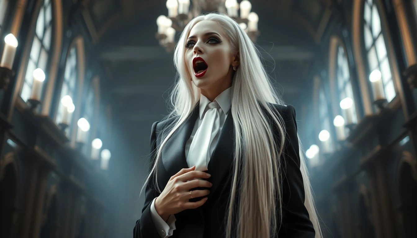 Woman, tall, voluptuous, long white hair, cosplay, phantom of the opera, half of her face is disfigured, she wears a fitted tuxedo, Black suit with white shirt an tie, she sings in a an operatic style, zoom out to show full body view from head to toe, Gothic lair