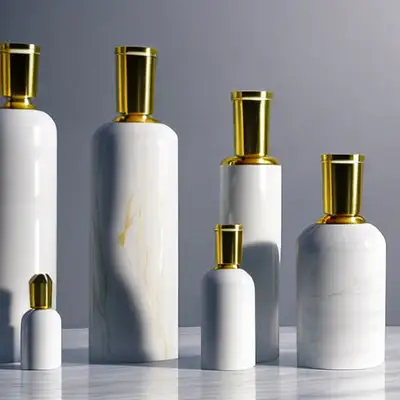 Picture a simple yet elegant scene featuring a collection of perfume bottles arranged neatly on a white marble surface. The bottles vary in size and shape, but all share a common theme of elegance and sophistication. Each bottle is designed with clean lines and minimalist details, such as a subtle gold cap or a delicate etched pattern. The bottles are unlabeled, but the color of the fragrances can be hinted at through the shades of the liquid inside. The background of the image is a soft gradient of white and gold, with subtle highlights that catch the light and add to the luxurious feel of the scene. The overall effect is one of understated glamour and refined taste, inviting the viewer to imagine the alluring scents and the indulgent experience of wearing them