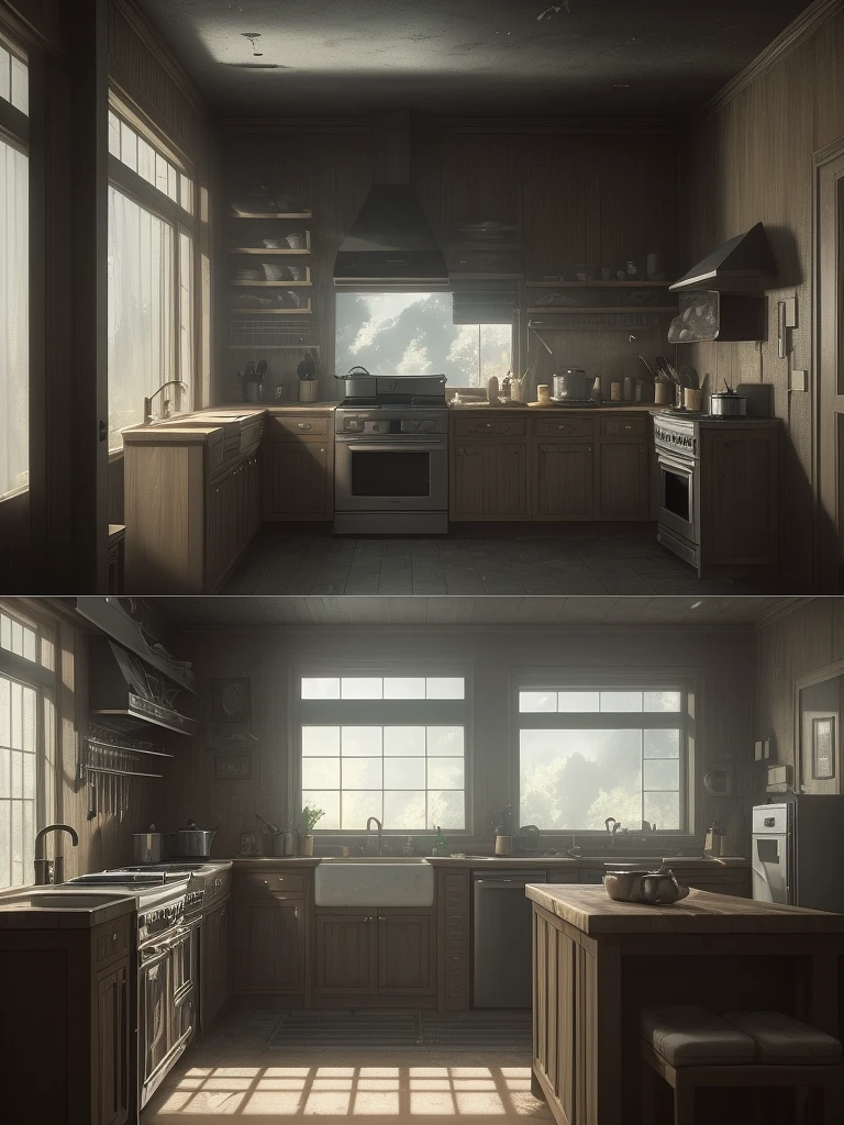 Photo of a ultra realistic kitchen, dramatic light, cinematic lighting, battered, low angle, trending on artstation, 4k, hyper realistic, focused, extreme details, unreal engine 5, cinematic, masterpiece, art by studio ghibli, intricate artwork by john william turner