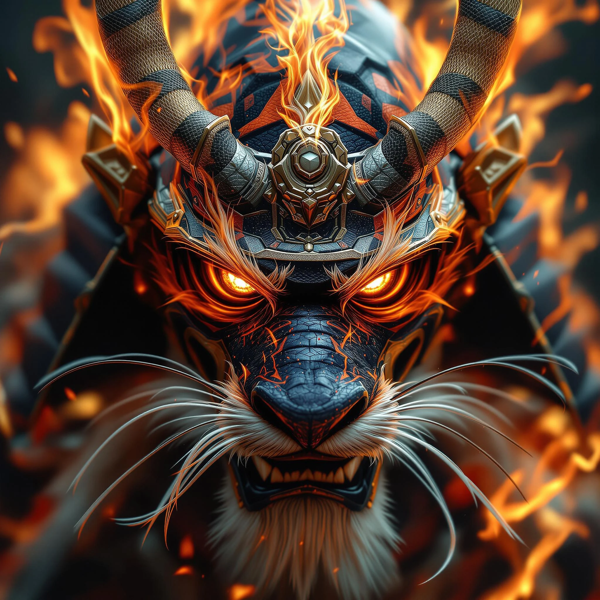 samurai dragon, eyes of fire, tiger coloured helmet, close angle, 8k ultra realistic, photography lighting, ultra detailed, photorealistic